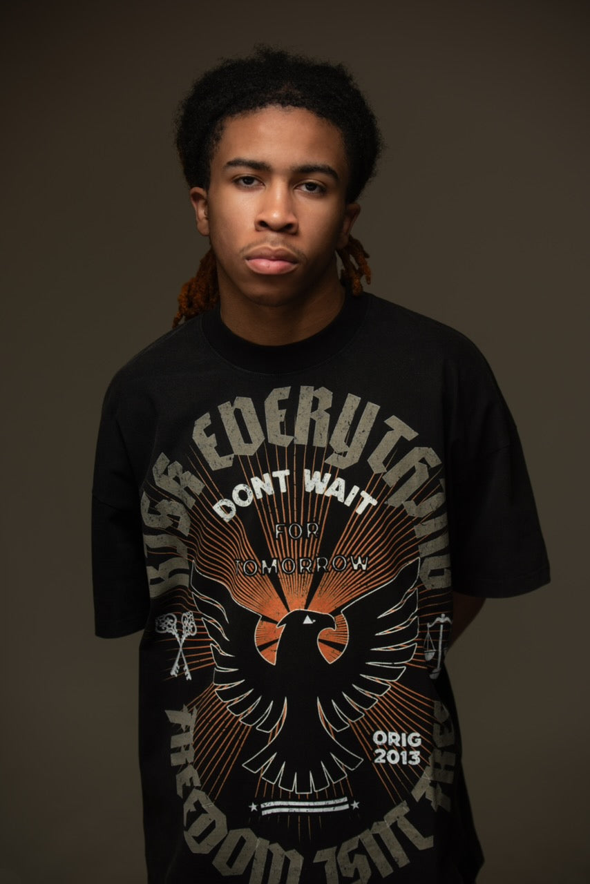 The bold front graphic hits differently on black — the phoenix, radiant burst lines, and distressed typography create depth and dimension against the washed backdrop. The tonal fading enhances the grit of the message: don’t wait for tomorrow.